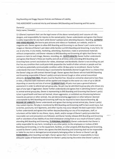 Our waiver below only applies to boarding and daycare pets, grooming pets do not require a waiver. Any and all boarding and daycare pets will need a waiver signed for them in person. Feel free to read the waiver below at your leisure before coming in to sign it, and call us if you have any questions!